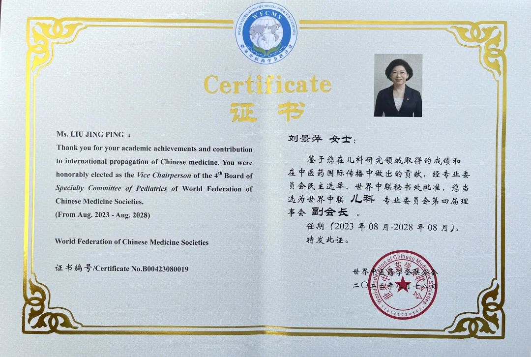 Stake官网药业集团党委书记、董事长刘景萍当选世界中医药学会联合会儿科专业委员会第四届理事会副会长